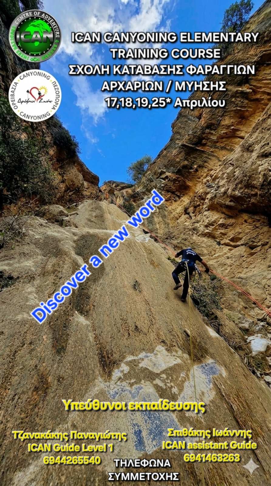 Οι Δρόμοι Ζωής διοργανώνουν σχολή κατάβασης φαραγγιών επιπέδου αρχαρίων/μύησης (elementary) με βάση τα πρότυπα του οργανισμού ICAN (International Center of Adventure & Nature).